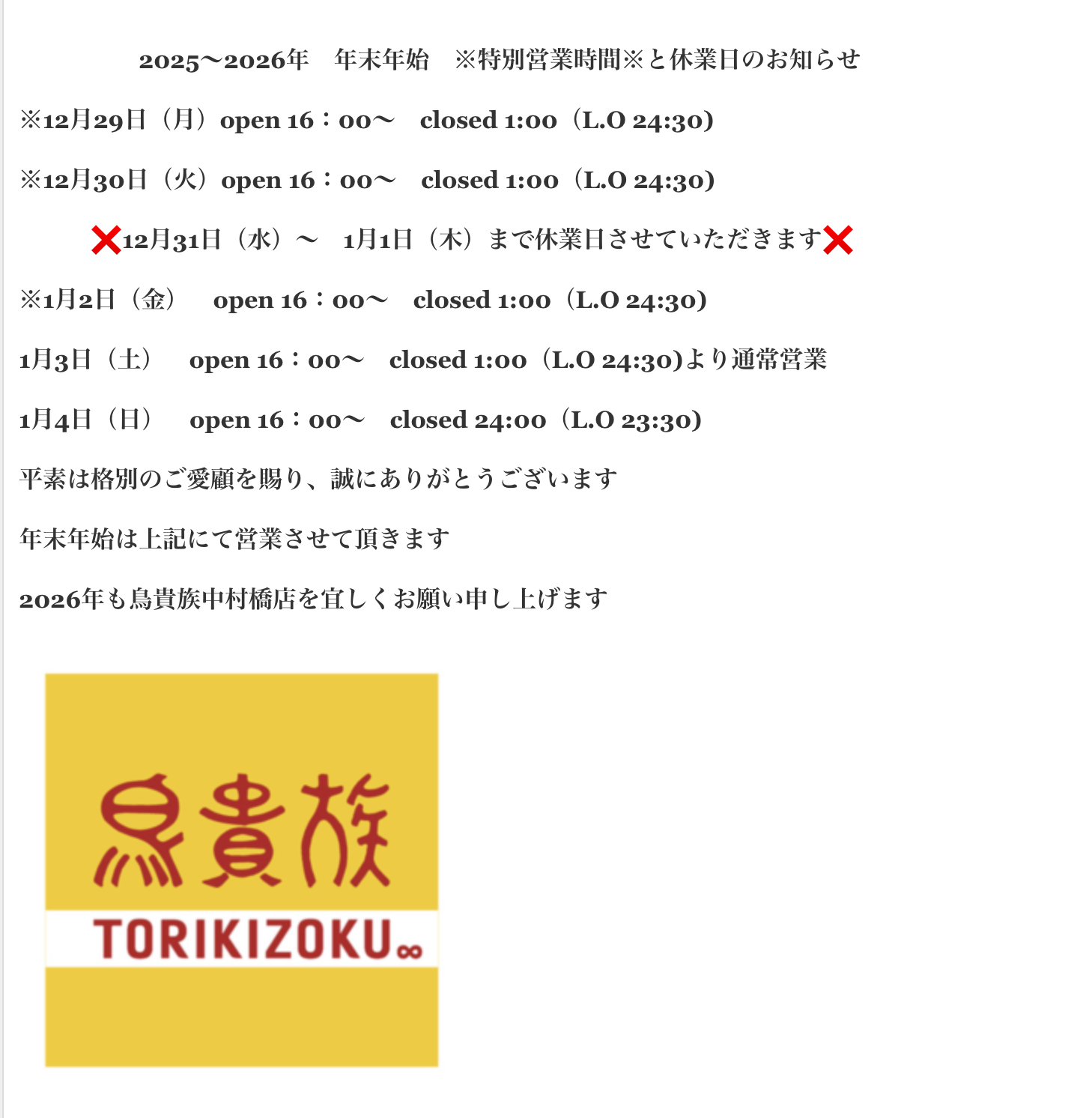 2026年も鳥貴族中村橋店を宜しくお願い申し上げます